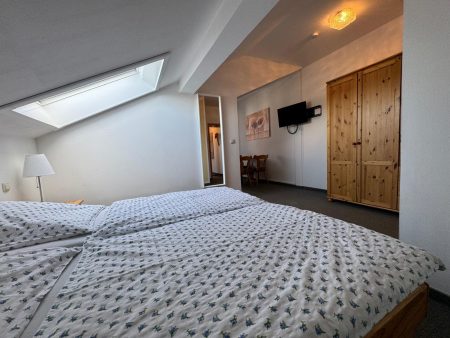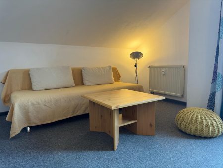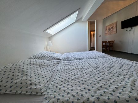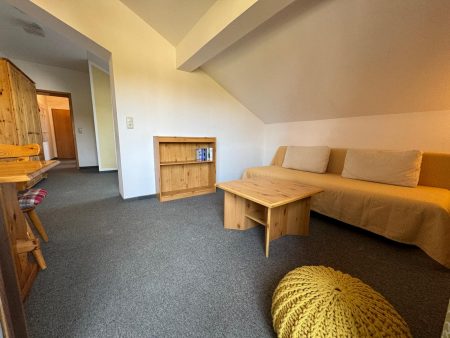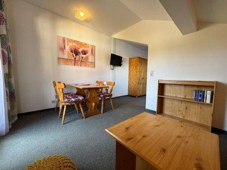 Auf ca. 50 qm erwartet Sie ein Flur, ein Badezimmer mit Dusche/WC, eine Küchenzeile (Kühlschrank, 2 Koch-Platten, Mini-Backofen, Kaffeemaschine, Wasserkocher etc.) sowie ein halboffener Wohn- und Schlafbereich inkl. Flachbild-TV. Hier können bis zu 4 Personen übernachten.